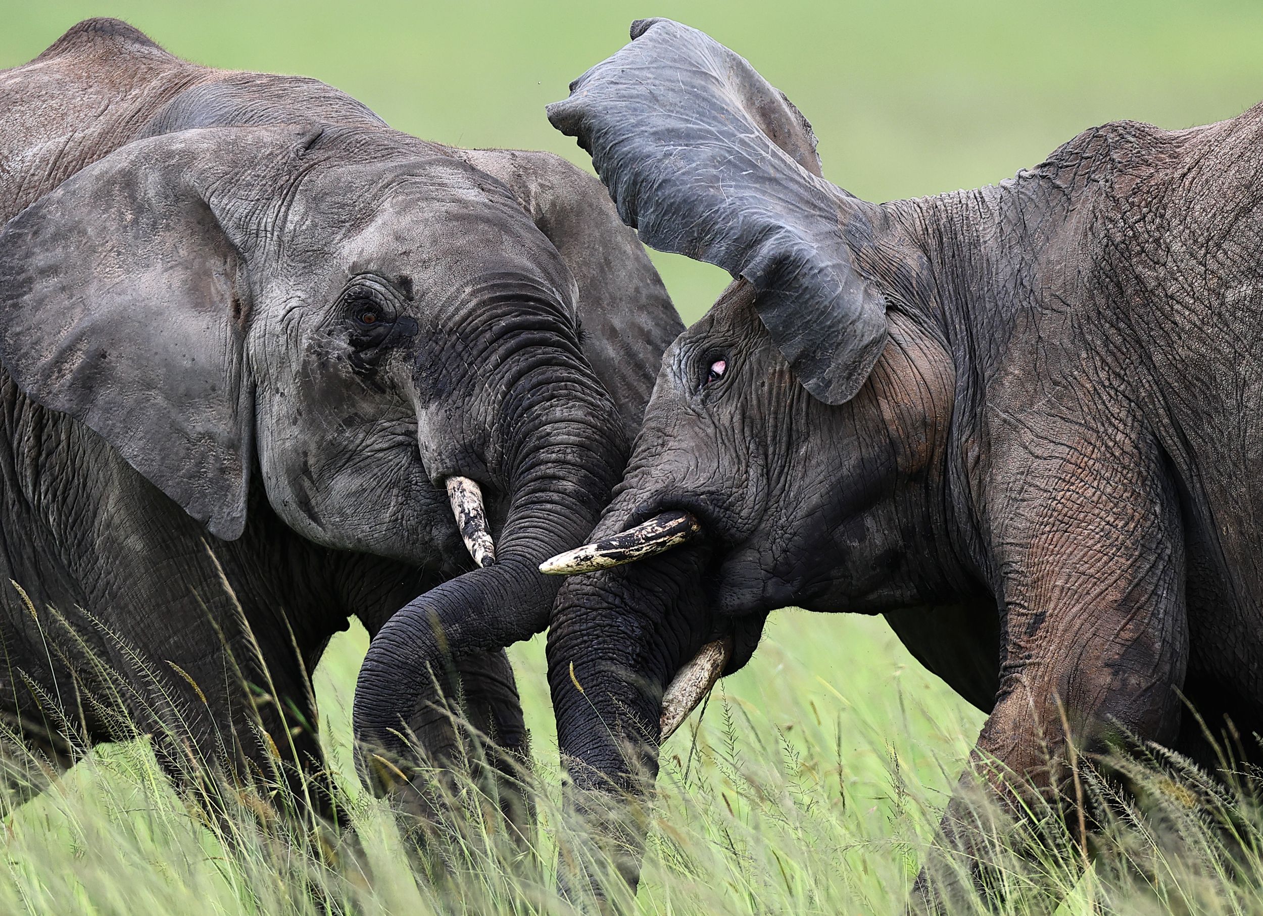 In this striking image by Gudkov Andrey, two African elephants are captured mid-play, their trunks locked and ears raised in a spirited yet gentle sparring match. Set against a backdrop of vibrant green grasslands, the scene highlights the complex social behaviors of these majestic creatures. Such interactions are vital for establishing dominance, strengthening bonds, and practicing communication within herds. The elephants’ wrinkled skin and expressive eyes convey both strength and sensitivity, offering a glimpse into their rich emotional lives. This moment, frozen in time, celebrates the beauty and intelligence of wildlife in its natural habitat.