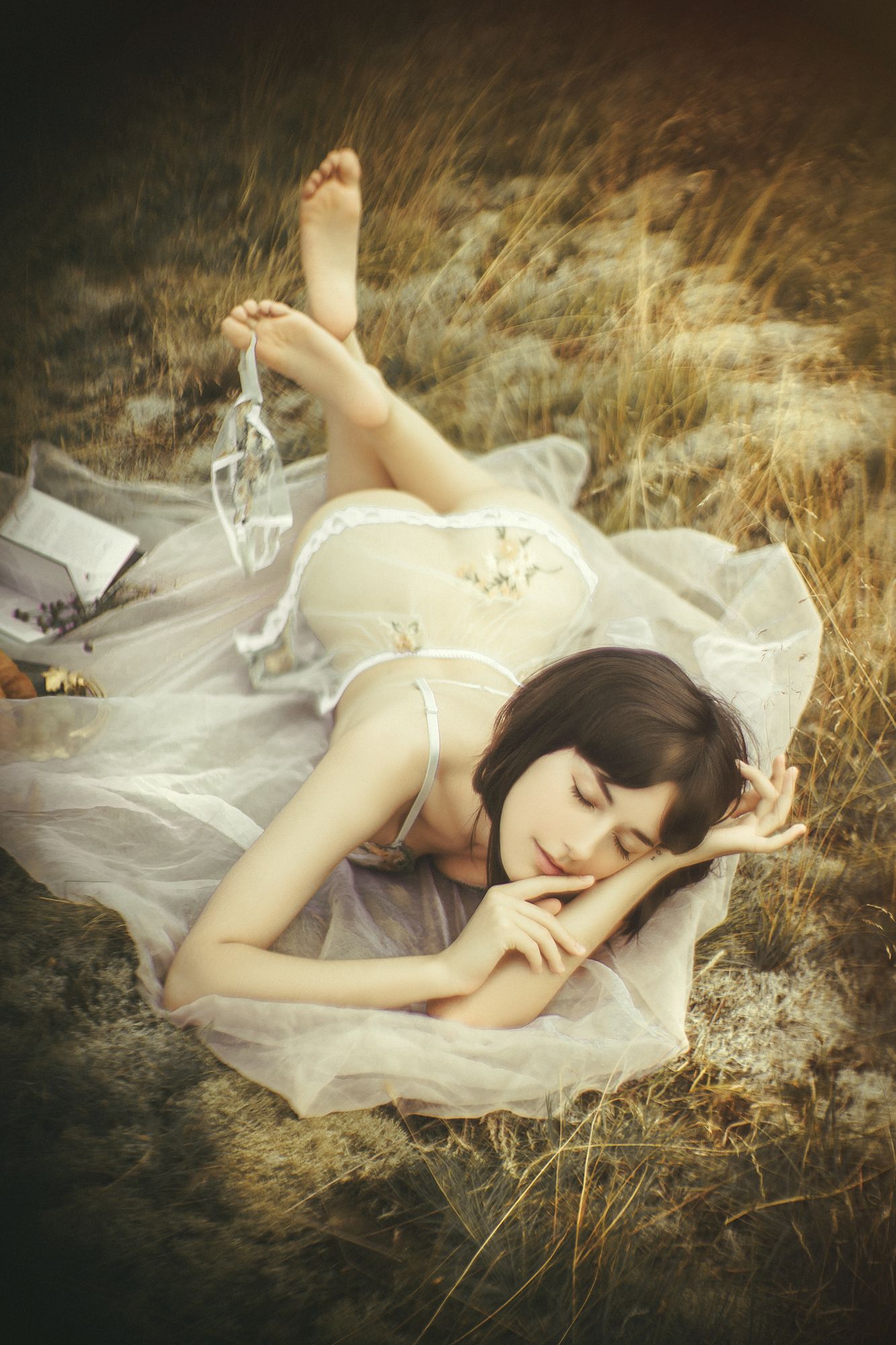 A tranquil moment captured in nature, where a woman lies gracefully in a sheer white dress, barefoot and serene, surrounded by sunlit grass. A wine glass and small box rest beside her, hinting at a quiet celebration or intimate pause. The soft lighting and dreamy atmosphere convey a sense of peaceful indulgence, blending natural beauty with subtle glamour. The composition, by photographer Ruslan Bolgov (Axe), emphasizes elegance and stillness, portraying summer not as a season of activity, but as one of gentle repose and quiet joy.