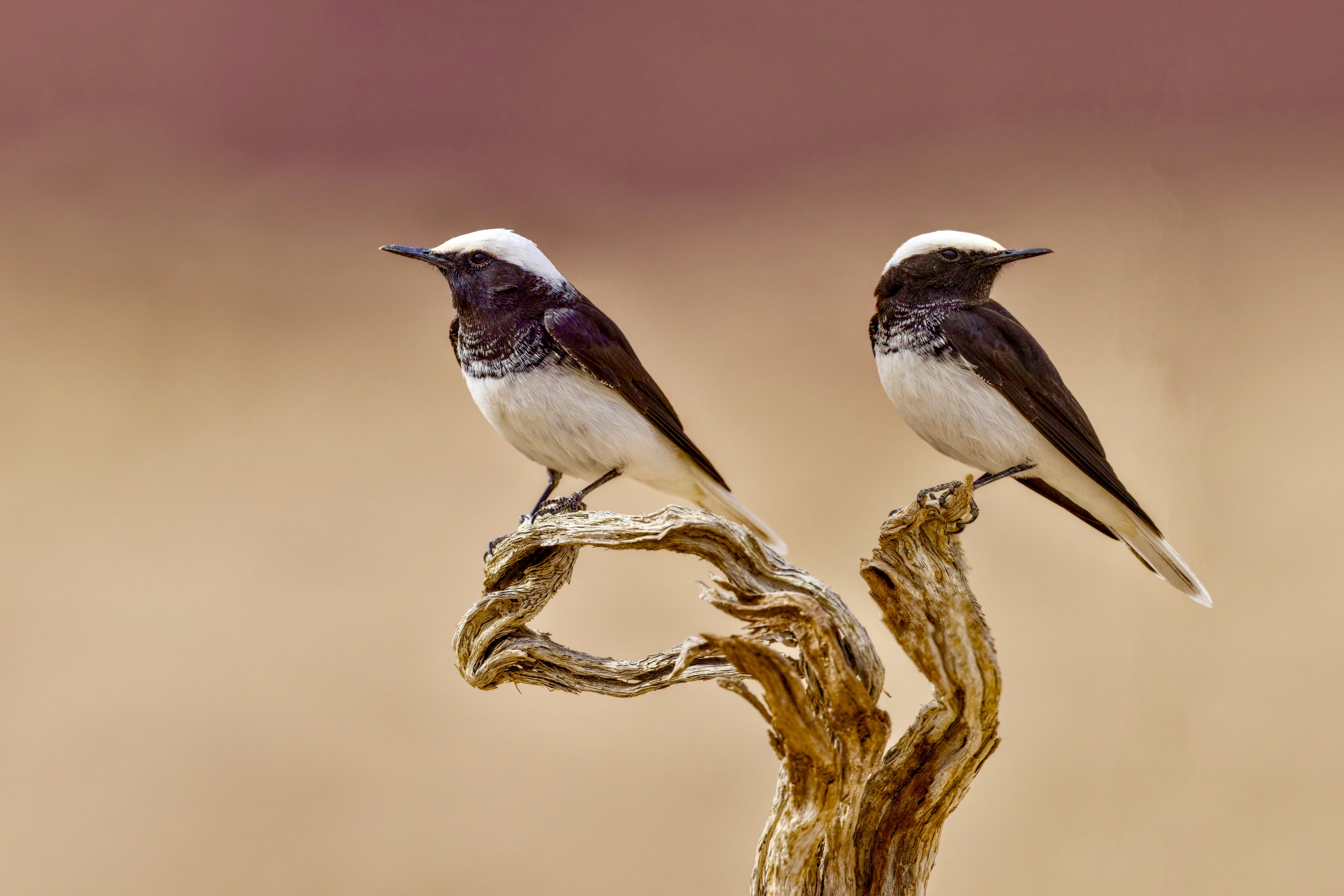 Captured in serene stillness, this image showcases two birds with bold black-and-white plumage perched on a gnarled, sun-bleached branch. Their poised stances and shared space suggest companionship or territorial calm. The blurred, warm-toned background enhances the focus on their delicate features and the texture of the wood. Photographer David Manusevich masterfully highlights the quiet drama of nature, where simplicity meets elegance in a single, balanced frame.