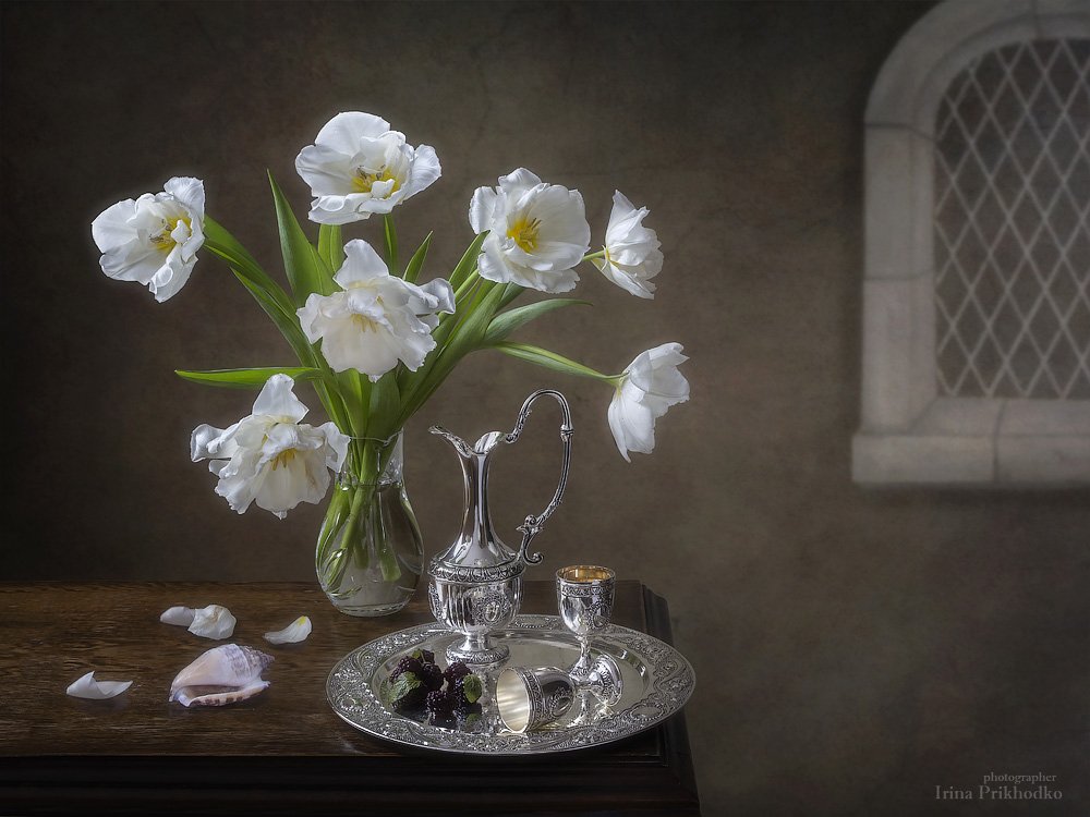 натюрморт, тюльпаны, букет, серебряная посуда, винтажный, Ирина Приходько