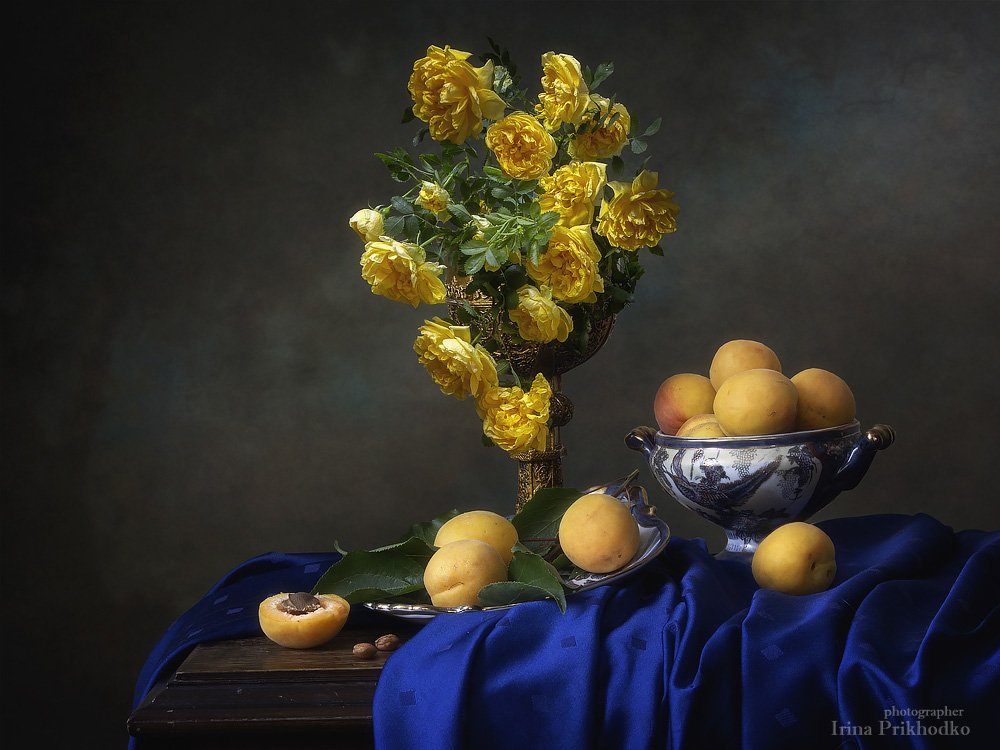 натюрморт, винтажный, художественное фото, букет, розы, лето, фрукты, абрикосы, Ирина Приходько