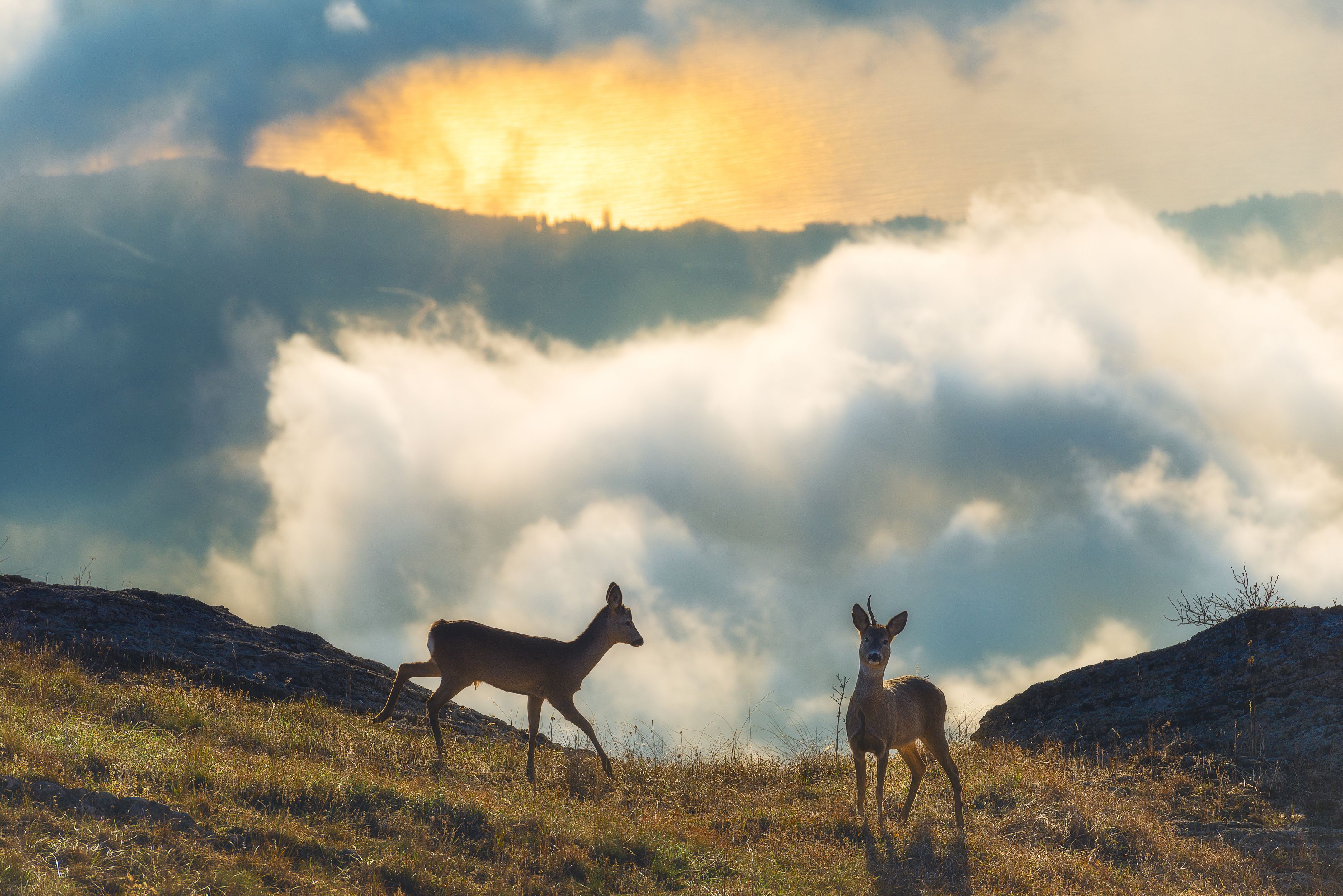 A tranquil mountain landscape captures two deer in silhouette against a dramatic sky where golden sunlight pierces through thick clouds. The foreground features a grassy slope with rocky outcrops, while the background reveals layered mountain ridges shrouded in mist. The scene evokes a sense of peace and wild beauty, highlighting the harmony between animals and their natural habitat. The soft light and atmospheric depth create a timeless, almost ethereal quality, emphasizing the quiet majesty of nature at dawn. Photographer: Oleg Feofanov.