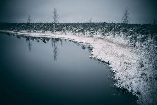 Cold winter landscape frozen snow swamp Kemeri