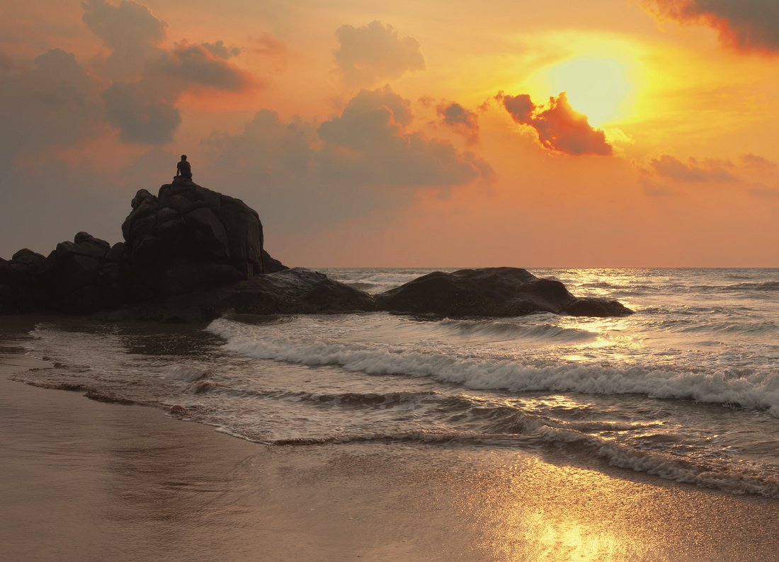 берег, песок, камни, человек, океан, волны, облака, закат, шри, ланка, Георгий Машковцев
