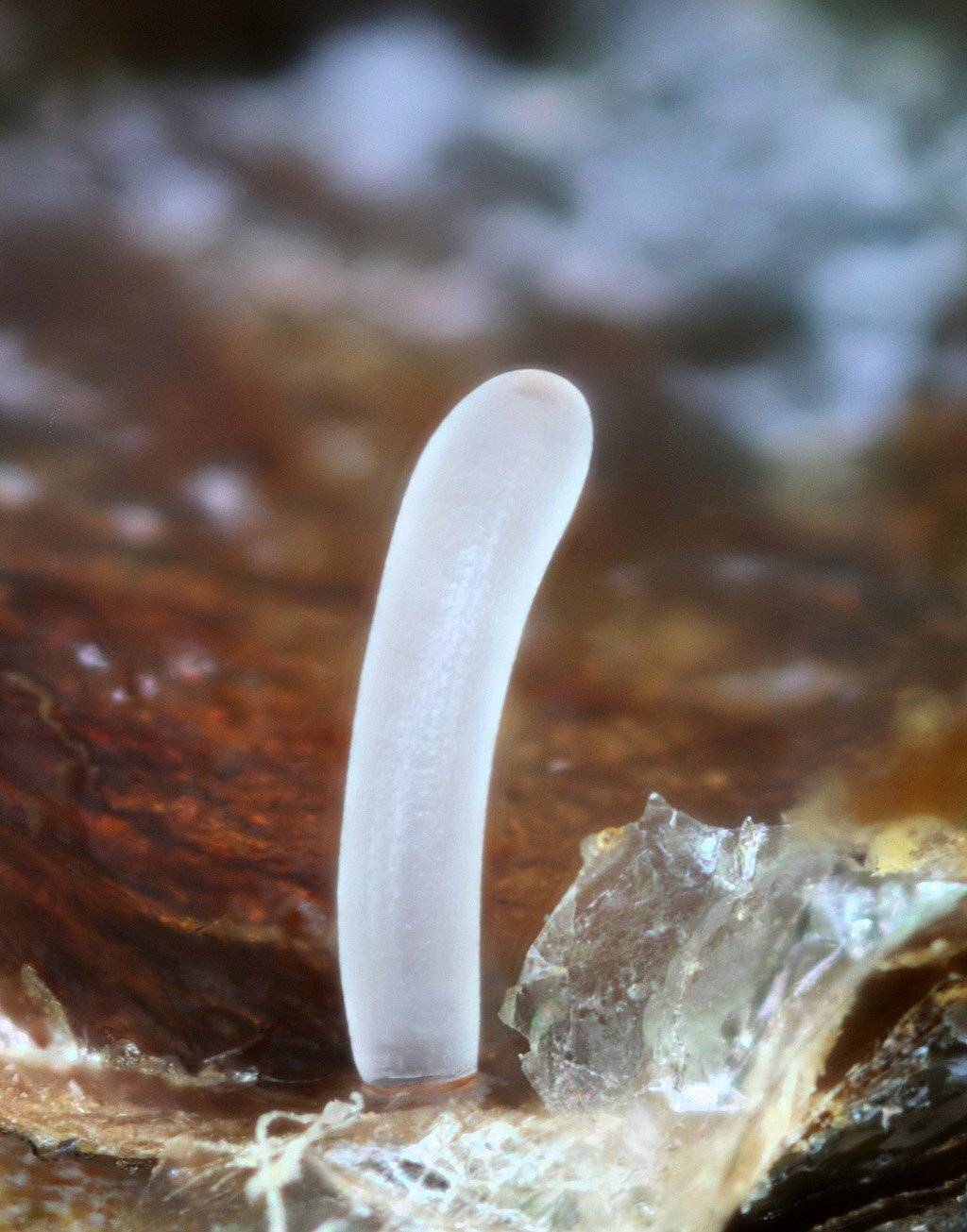 Разновозрастный пчелиный расплод с большим увеличением. Личинки плавают в мутноватом маточном молочке.