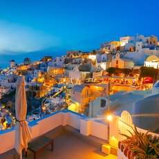 Panorama of Oia at sunset, Santorini, Greece