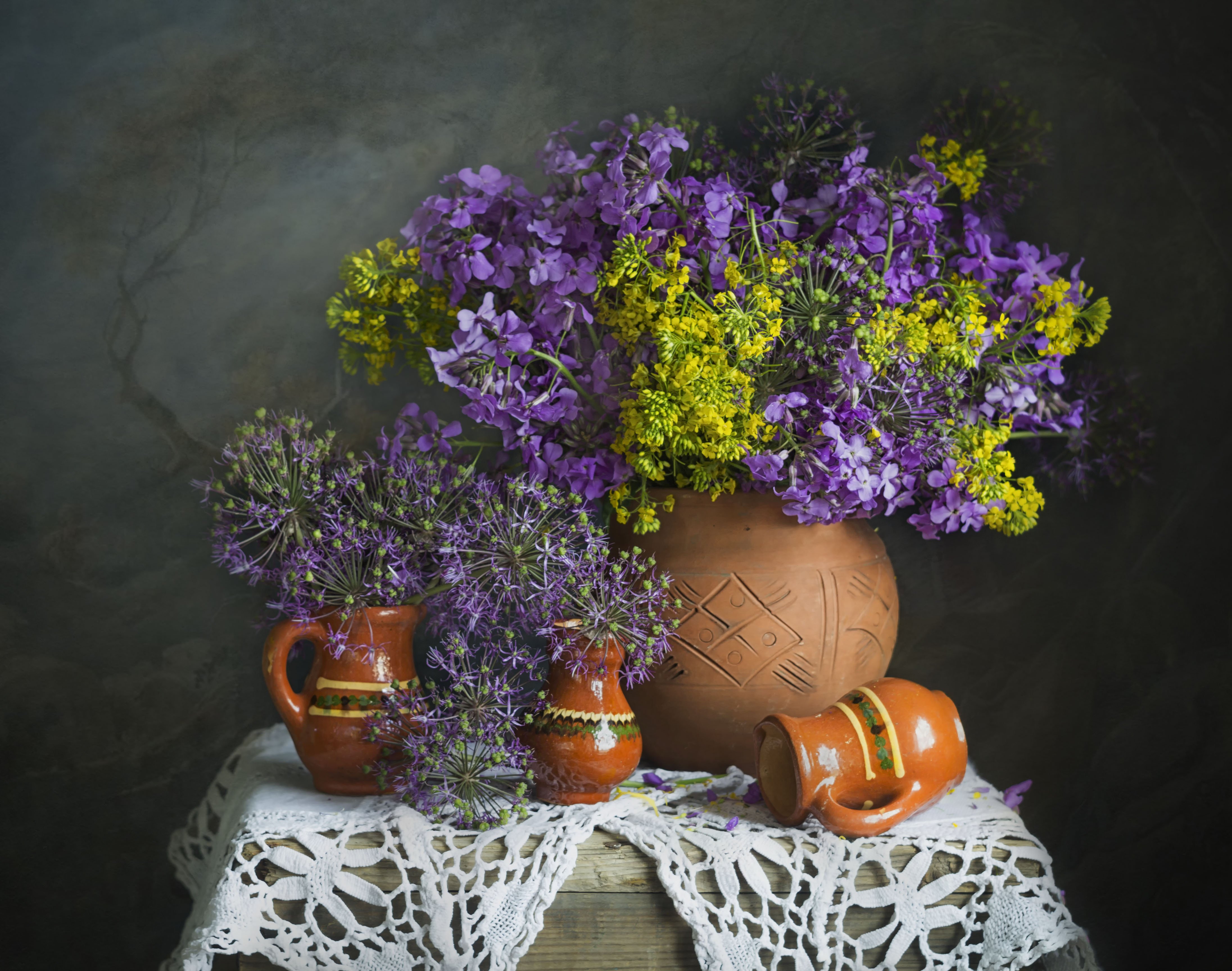 полевые цветы, кувшинчики из глины, вышитая скатерть, букет цветов, Лионелла Зимина