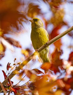 Овсянка в листве японского клена