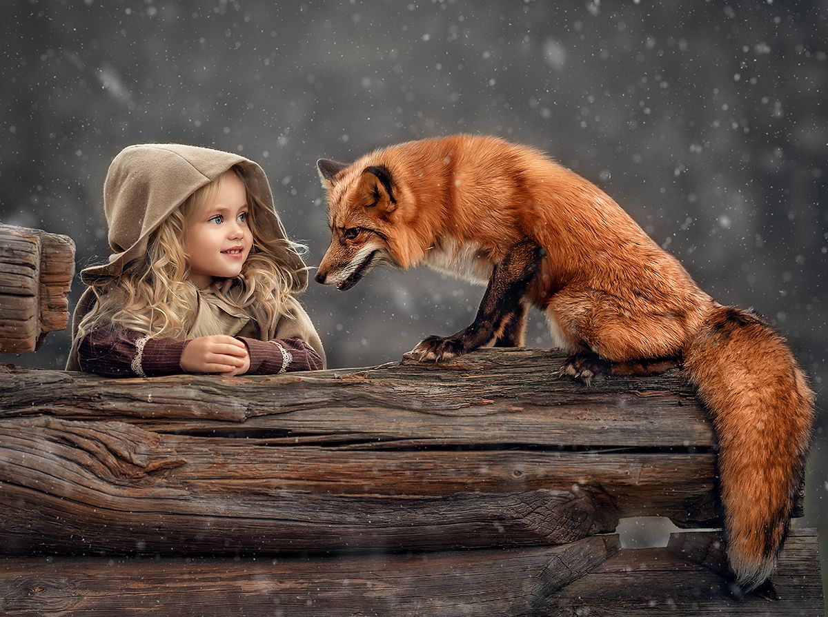 Amidst a gentle snowstorm, a young girl and a red fox meet on a rustic wooden beam, their eyes meeting in a moment of quiet understanding. The girl, wrapped in a soft hooded cloak, leans forward with gentle wonder, while the fox, poised and alert, returns her gaze with calm curiosity. Snowflakes drift around them, blurring the line between fantasy and reality. This serene encounter captures the fragile, beautiful connection between human and wild, a fleeting harmony in nature’s hush. Photographer Elena Mihaylova masterfully frames the scene, evoking warmth and wonder in the midst of winter’s chill.