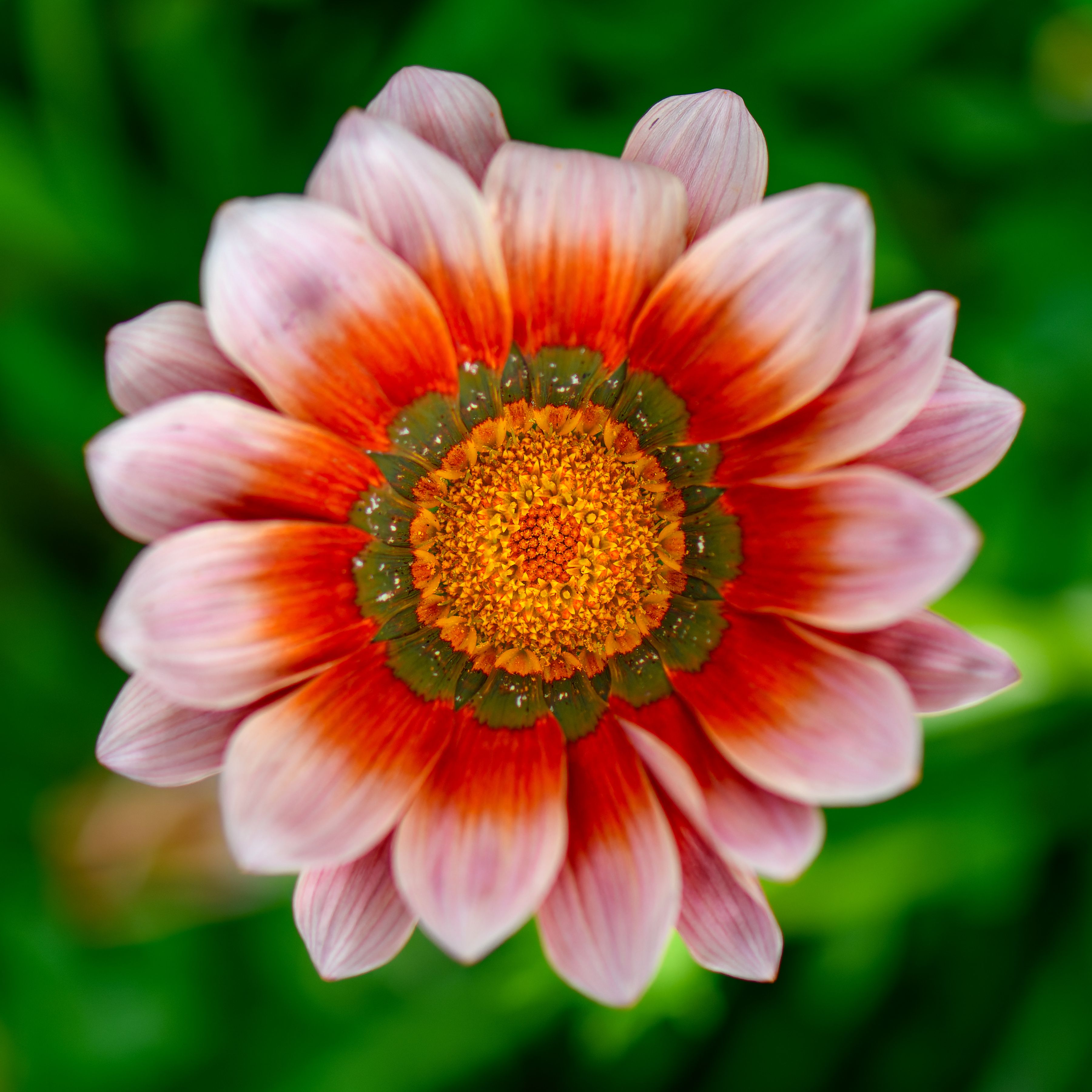 Like all compounds, gazania flowers in flower heads that are often taken for simple flowers. The capitula are solitary at the end of peduncles just beyond the leaves. Each capitulum is formed by a central disc of tubular flowers, surrounded by ligulate peripheral flowers, whose color is very variable. The orange-yellow flowers are however the most numerous, often with black spots at the base of the ligules. The fruit is an achene, containing several seeds.