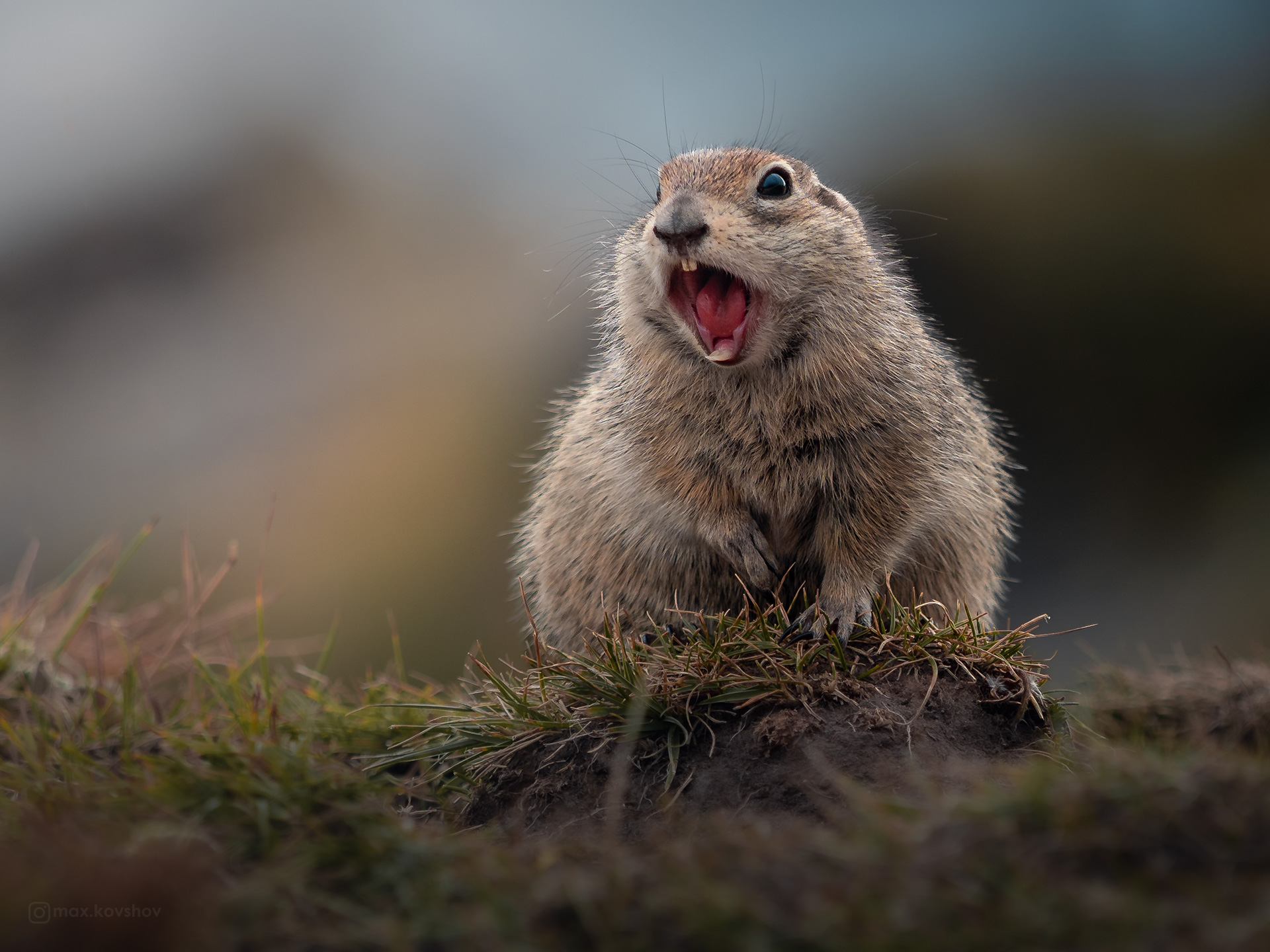 In the rugged terrain of the Caucasus, a ground squirrel freezes mid-scream, its tiny body upright and mouth agape in alarm. The moment, captured by photographer Maks Kovshov, reveals raw, unfiltered wildlife emotion—perhaps a warning call or a startled reaction to a predator. Set against a soft-focus backdrop, the creature’s fur blends with the earthy tones of its habitat, emphasizing its natural camouflage. This image, titled “атас!” (Oh my God!), speaks to the sudden, dramatic moments that unfold in nature’s quiet corners.