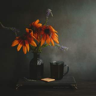 coffee, cookies, flowers, still life,цветы, натюрморт, фото натюрморта, еда, кофе, печенье, чайник, утро, темно, легкий, затемненный, напиток, закуска, ваза, Стасов Виталий