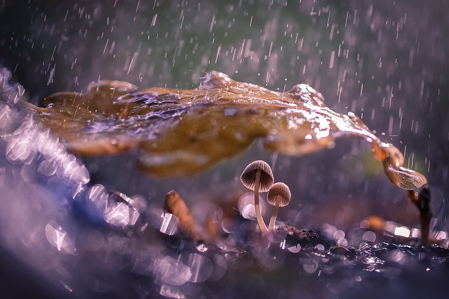 In the soft downpour, a withered leaf arches protectively over a cluster of delicate mushrooms, creating a miniature ecosystem. Water beads on the leaf’s surface, tracing paths toward the damp earth below. The scene captures a fleeting, intimate moment in the forest’s cycle—where decay nourishes new life. The blurred background and shallow depth of field emphasize the fragile beauty of this hidden world. A testament to nature’s quiet persistence, even in the smallest corners.