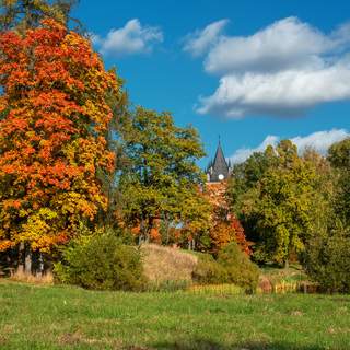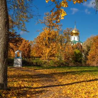 Деревянная церковь святителя Василия Великого гармонично вписывается в архитектуру улицы, ярко выделяясь на фоне деревянных домов комплекса \"Русская деревня\".