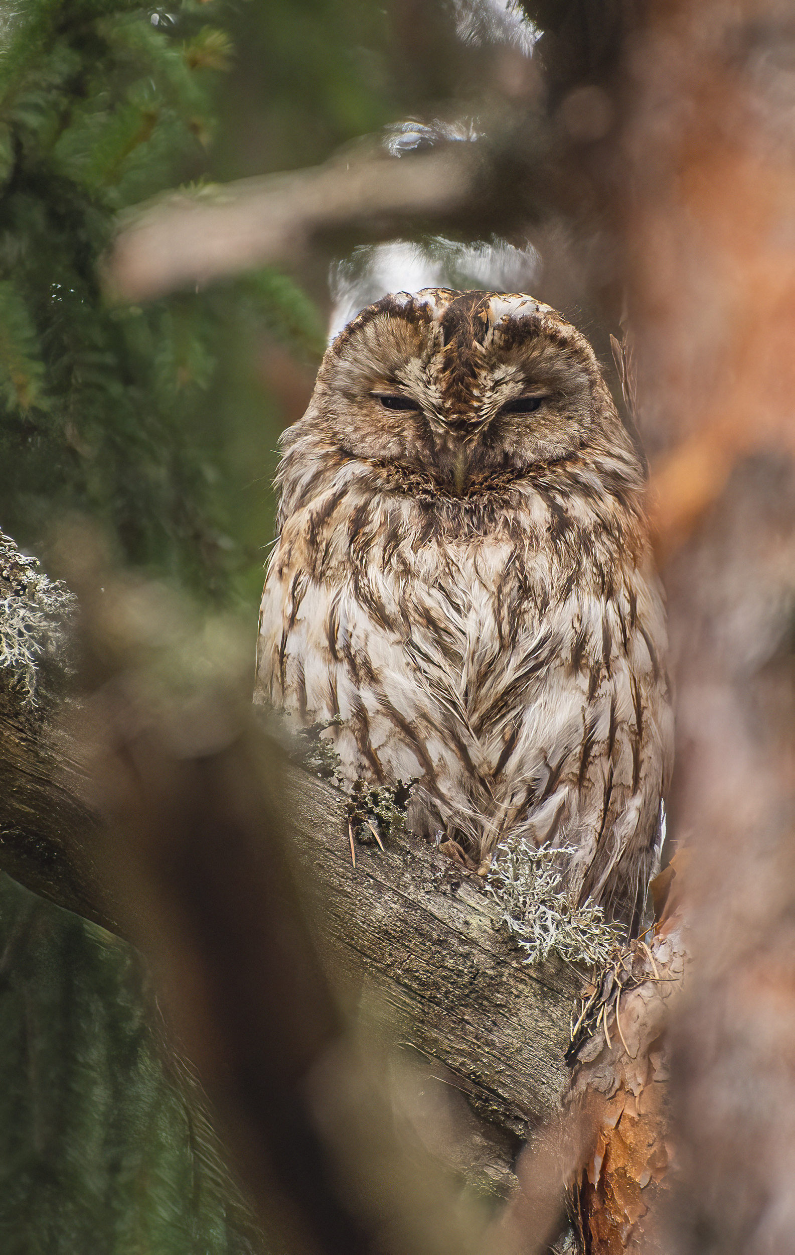 Помните, я показывал замечательных птенцов серой неясыти? Вот, как раз сейчас вы видите маму героиню, тех самых птенцов :) ... По большей части, совы при встрече с человеком, не сильно реагируют. Они рассчитывают на свою маскировку. И правда, заметить её не так было и легко. Я заметил необычный выступ на дереве, и только когда посмотрел через объектив, понял, что вот она удача :)