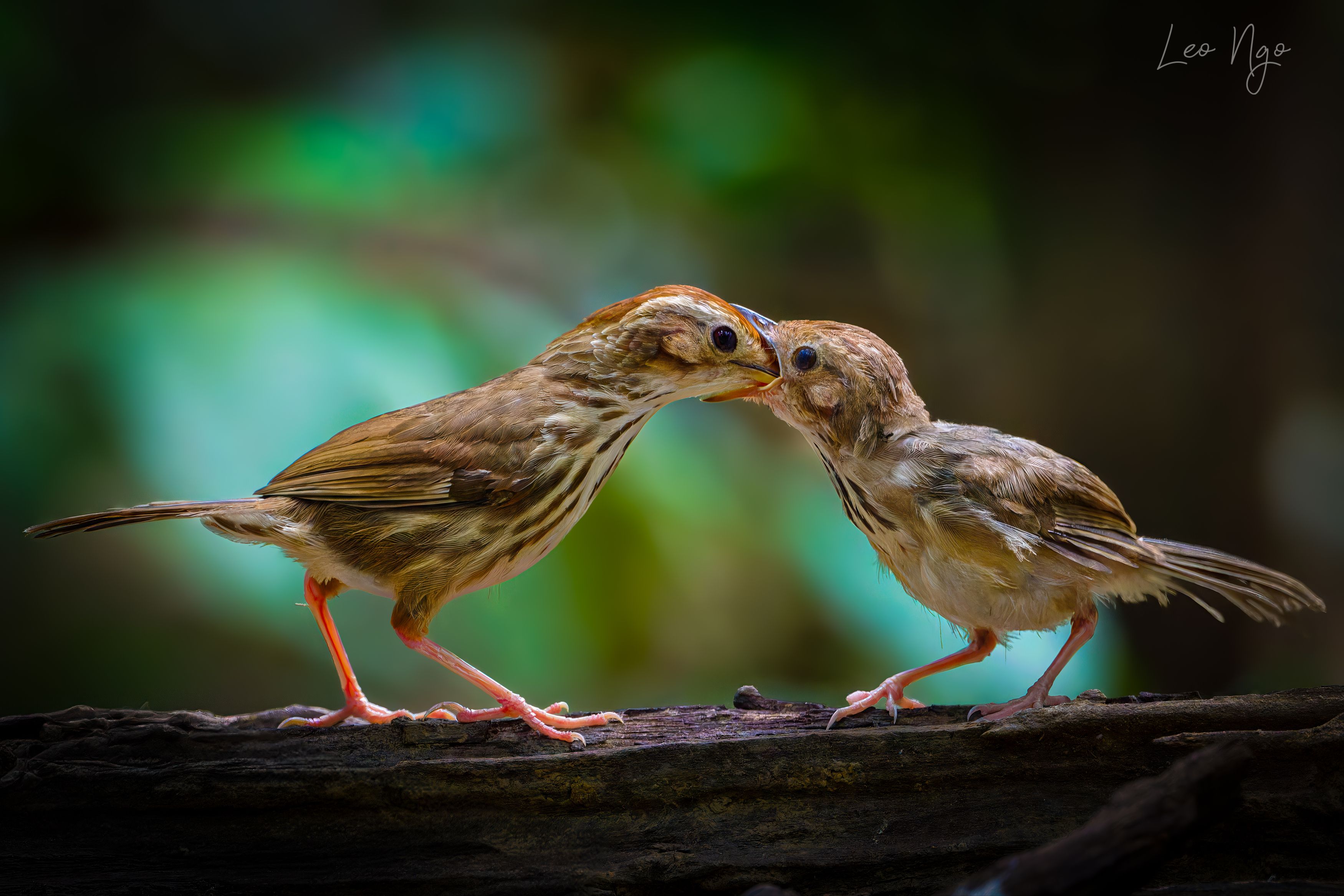 In the soft glow of dappled forest light, two fledglings engage in a delicate, almost human-like gesture—touching beaks in a moment of connection. Their brown-streaked feathers blend with the earthy tones of the log beneath them, while the blurred green backdrop whispers of a thriving woodland. This intimate exchange, captured with remarkable clarity, speaks to the often-overlooked emotional lives of wild creatures. It’s a fleeting yet powerful reminder that even in the animal kingdom, tenderness and bonding are deeply rooted. Photographer Leo Ngo masterfully freezes this ephemeral moment, inviting viewers to witness the quiet poetry of nature’s relationships.