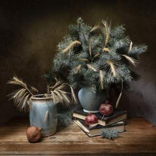 In this evocative still life by Tatyana Fedenkova, the essence of pre-winter is beautifully captured. Delicate snowball branches in a rustic vase stand beside small pumpkins, chestnuts, and a white mug, all arranged on a softly lit tablecloth. A rich brown knitted shawl and a sandglass add warmth and the passage of time. The muted, earthy tones and soft lighting evoke a sense of calm introspection, as nature prepares for dormancy. This composition celebrates the quiet beauty of autumn’s final breath before winter arrives.