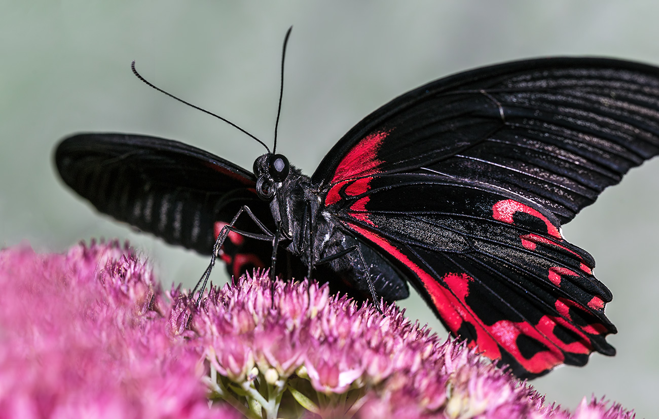 Papilio rumanzovia... Английское название бабочки Scarlet Mormon или Red Mormon... Выведена из куколки в домашнем инсектарии. Макро-вспышка YongNuo YN24EX.
