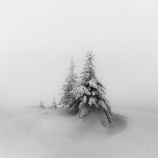 Зимний лес в тумане. Одинокое дерево словно вырастает из белого безмолвия, его тёмный ствол — единственный акцент в мягком мире света и инея. Пространство между ветвями наполняется дыханием тишины.
