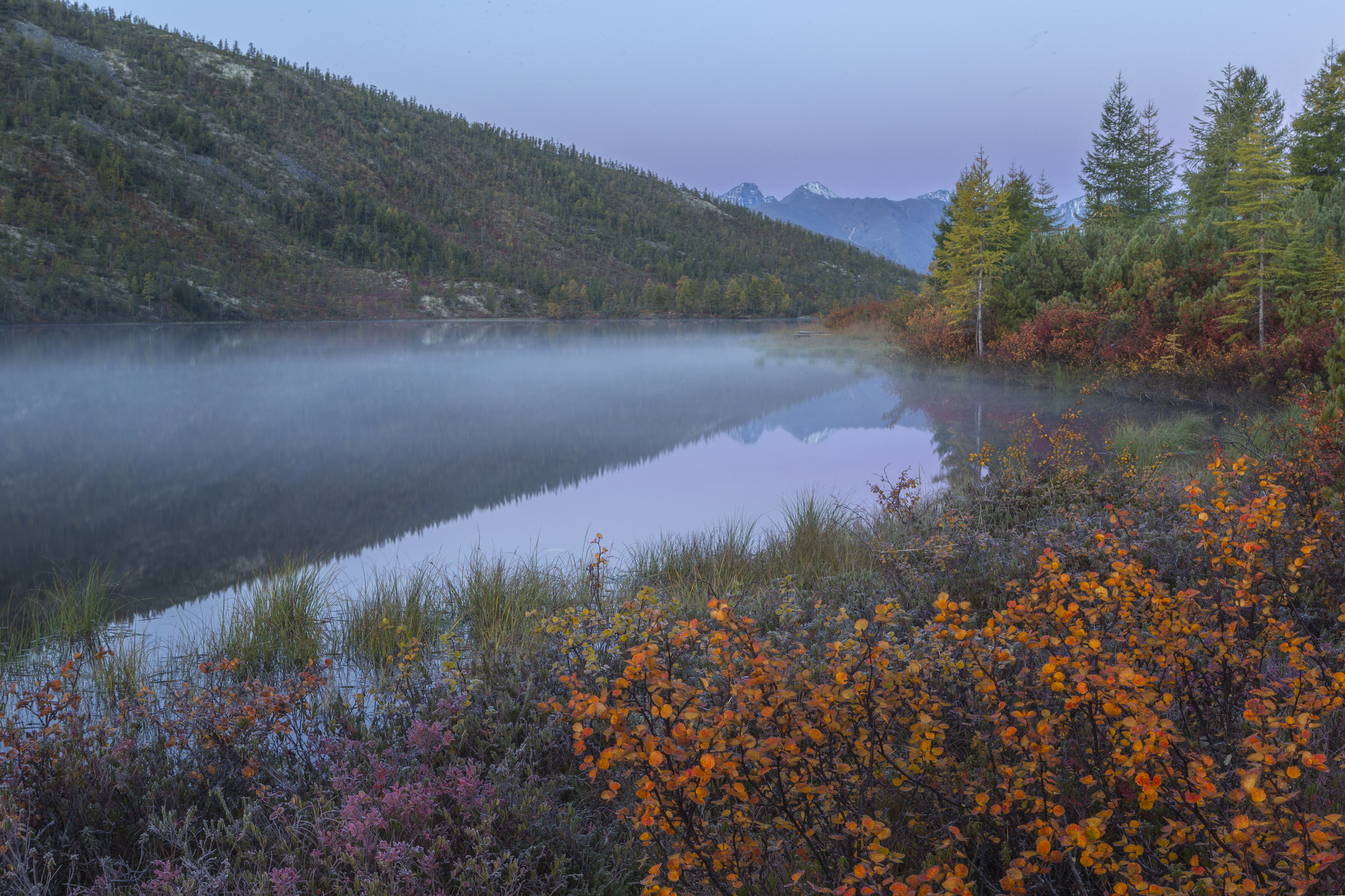 Прибыв на озеро Джека Лондона,мы буквально на следующий день ,на рассвет,пошли на легендарное озеро танцующих хариусов.Красивого рассвета не предвиделось,но предрассветный пояс Венеры,туманчик и морозный иней на кустах морожка,голубики и карликовой березки,нас порадовали!