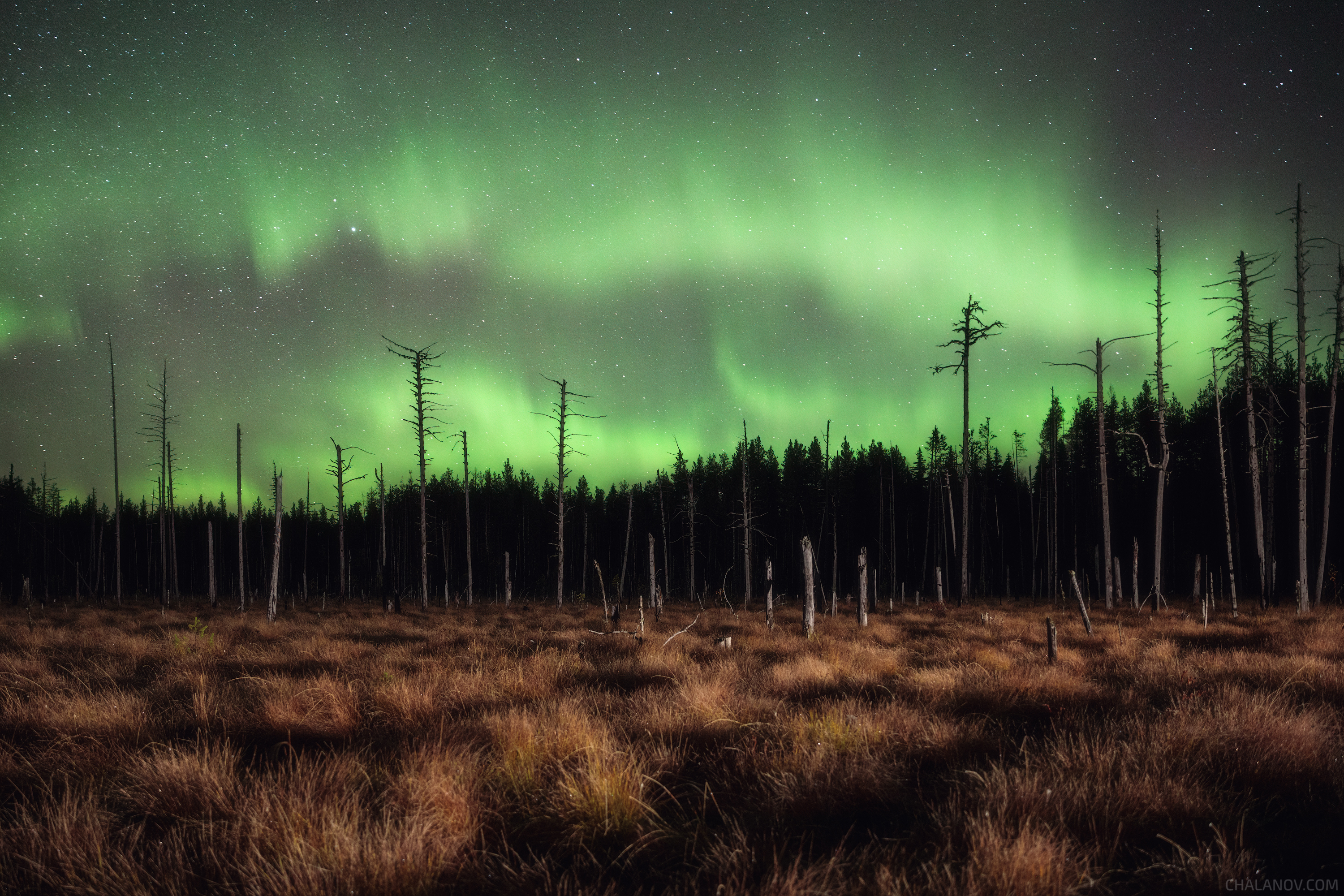 северное сияние, пейзаж, ночь, звезды, полярное сияние, аврора бореалис, болото, осень, Иван Чаланов