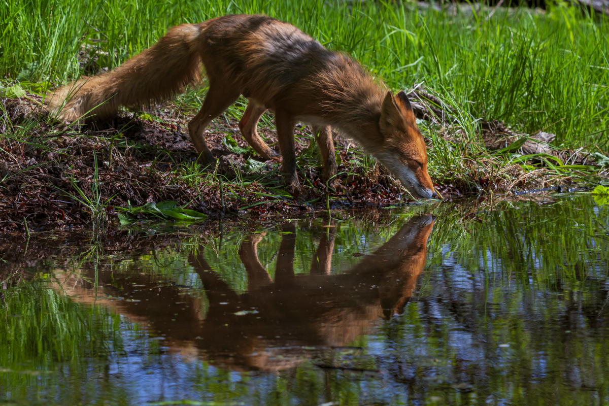 Мама лиса жарким летним днем у ручья