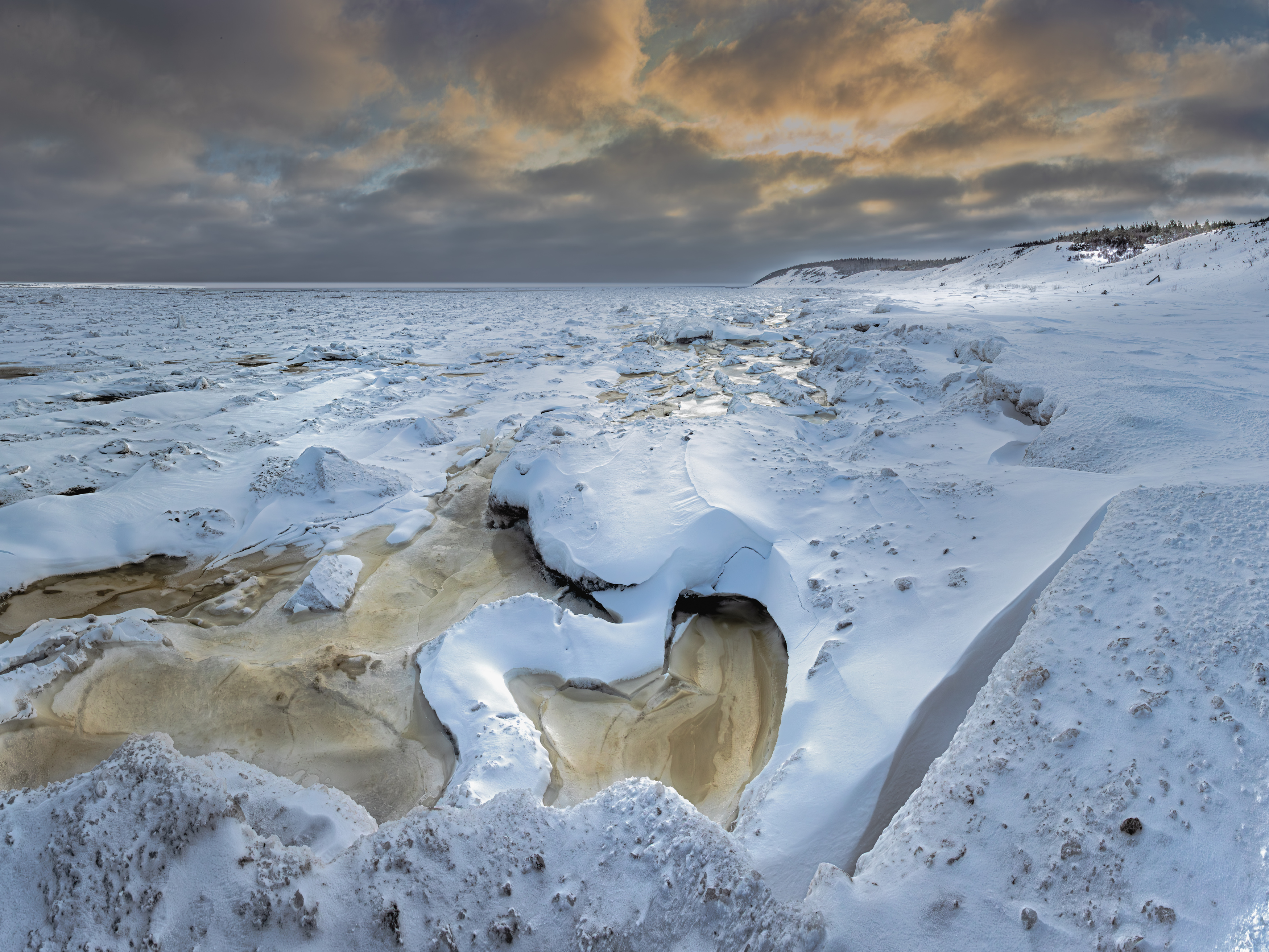 Песчаная литораль Онежского берега Белого моря зимой покрывается интересной текстурой льда, среди участков почти непроходимых торосов возникают относительно ровные поля, где ледовые наломы чередуются с окнами песочного цвета, сквозь которые видно дно.