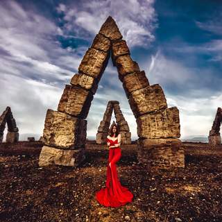 Woman in red sits on dark rocks, dress flowing like flame — bold and raw. 🔥