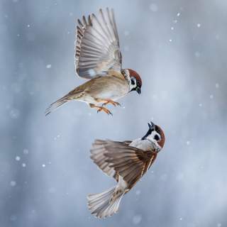Четыре птицы на ветке — как будто замерли в снежной сказке, и каждый взгляд говорит о тихом общении.