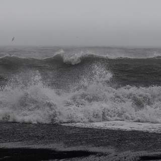 A vast monochrome shoreline dissolves into fog, where land, sea, and sky merge into a single muted plane. Two distant figures emerge as fragile silhouettes against the immensity of the landscape, emphasizing scale, isolation, and human vulnerability. The dark sand acts as a visual anchor, while the mist erases depth and direction, transforming the scene into a quiet meditation on presence, absence, and the smallness of the human trace within nature.