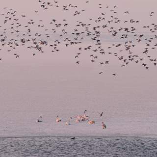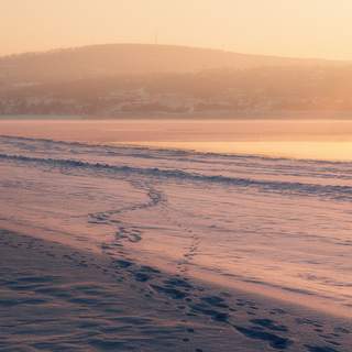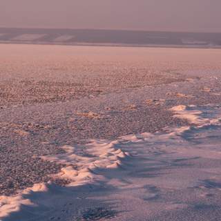 Одинокая фигура человека на бескрайнем замерзшем озере. Мягкий свет заката окрашивает снег в пастельные тона. Зимний минимализм и ощущение простора