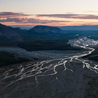Озеро Джека Лондона, Колымское нагорье, рассвет. На заднем плане - хребет Аннгачак. Во второй половине июня основная часть озера еще подо льдом, только узкая полоса у берега очистилась от него. Уровень воды высокий и многие деревца оказались на островках, превратившись в настоящие произведения искусства.