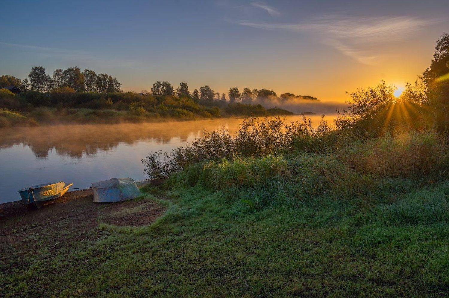 рассвет река туман лодки утро сентябрь молога