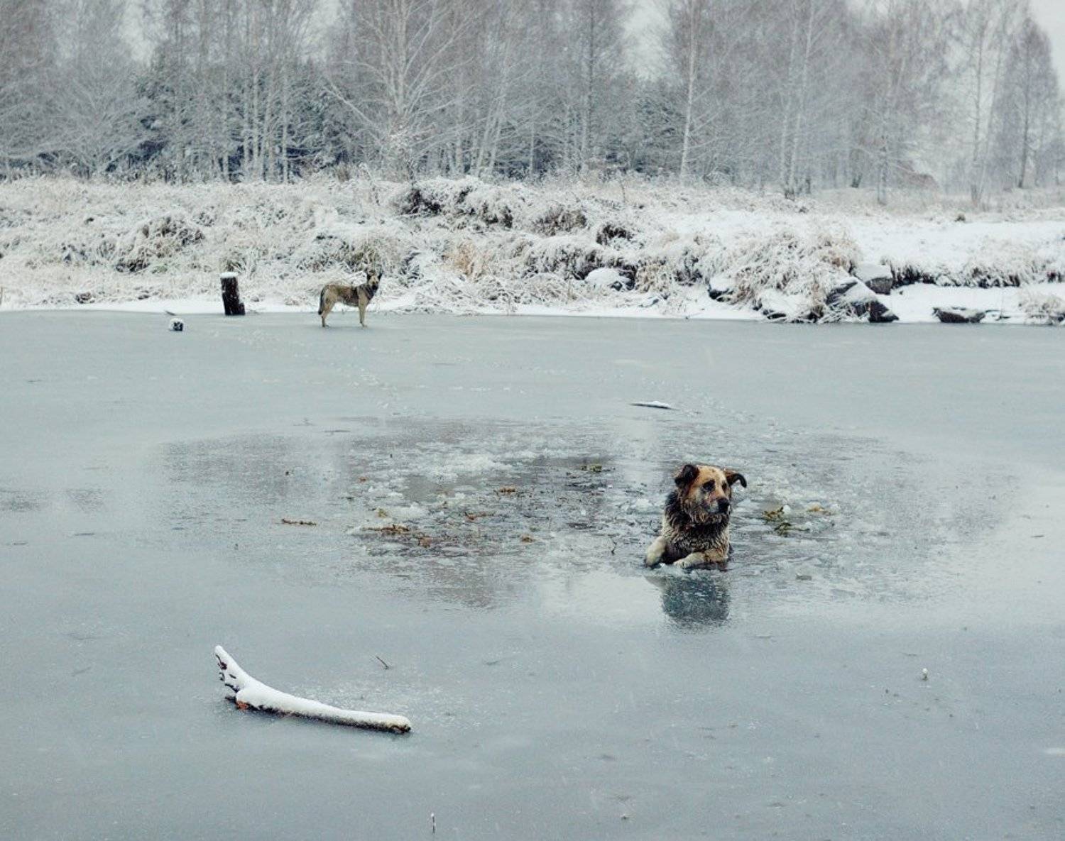 Как говорится - "снимаю шляпу"). Сам в прошлом году столкнулся с подобной ситуацией, правда собака была моя. Забыл про все на свете, и про фото и про холод, когда пёс выскочил на лед и ухнулся туда всей своей 40 килограммовой овчарочьей тушкой. Однако не смотря на на то, что пришлось навредить дереву(как и в вашем случае), собака его использовала вцепившись зубами. В общем не сторонник я купания зимой, но иногда и такое случается).