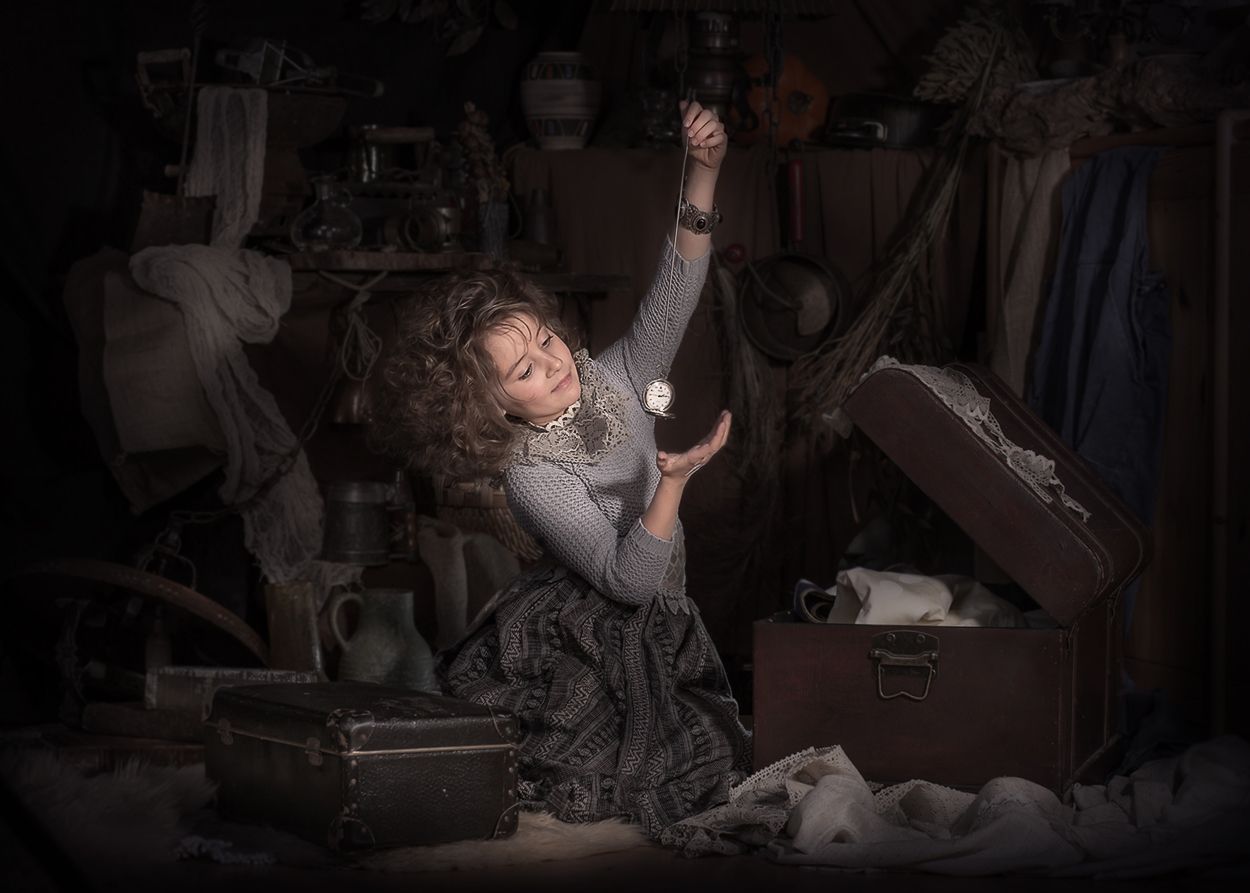 Бабушкин чердак всегда таинственное и манящее место. Так притягивает втайне от родителей забраться и окунуться в мир фантазий и сказок, разглядывая старые вещи в сундуке...Там всегда темно и прохладно и жутко интересно...Попав на чердак, Даша забыла обо всем...время пролетело незаметно и детский сон одолел маленькую девочку...Мама нашла дочку, уснувшую прямо на сундучке, среди старинных вещей. Легонько разбудила ее и поведала увлекательные истории о старых предметах , что нашла девочка в сундуке...
