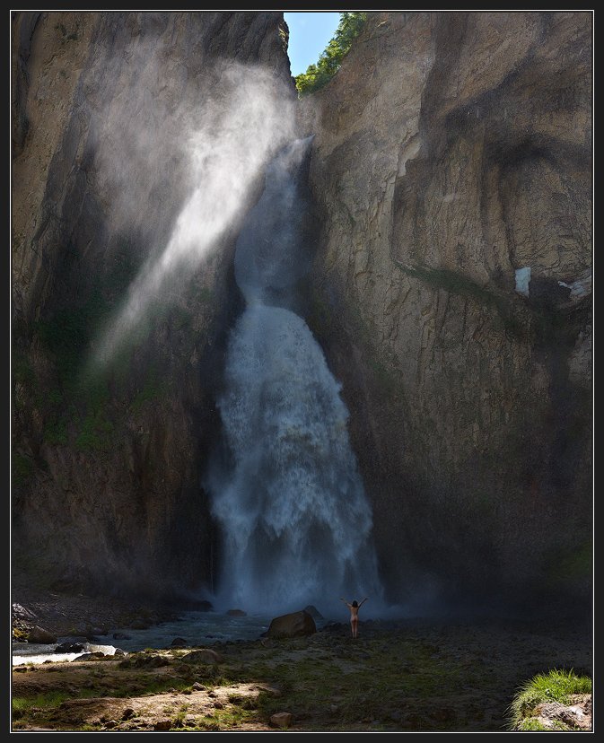 Сначала уговаривал жену постоять для масштабу. А потом не хотела уходить. Душ Шарко залипает)