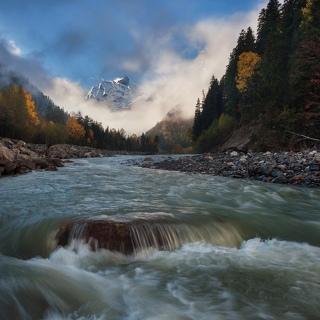 Осенний карнавал красок в ущелье Адыл-Су и покрытая свежим снегом гора Джантуган,Кабардо-Балкария