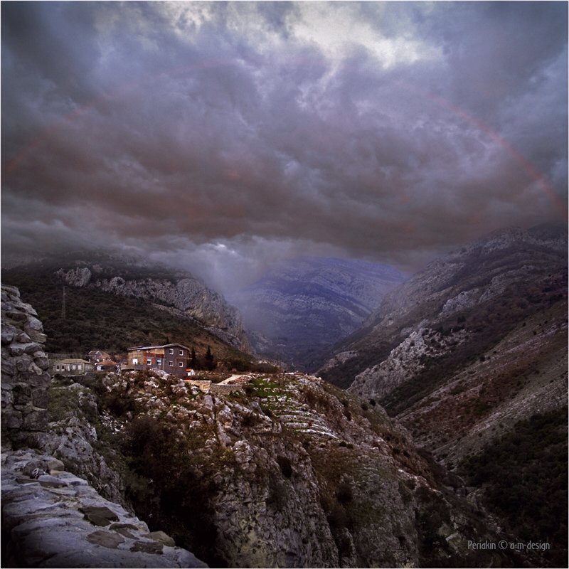 горы, селение, ущелье, тучи, радуга, Виктор Перякин
