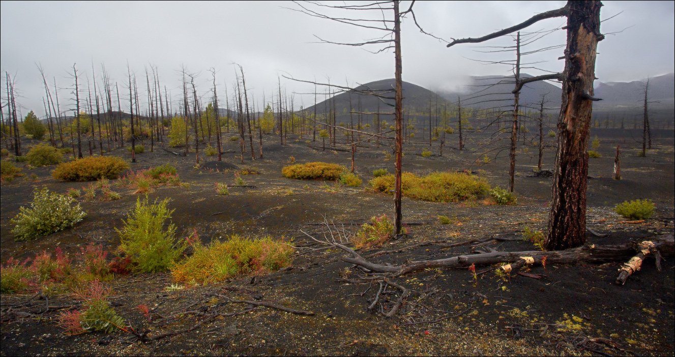 Слой вулканического пепла, укрывающего этот участок – от 2 до 8 метров. Взгляду открыты только верхушки лиственниц, которые во время извержения в районе вулкана Плоский Толбачик были не сожжены лавовыми потоками, а обожжены и задушены растущим слоем горячего пепла.