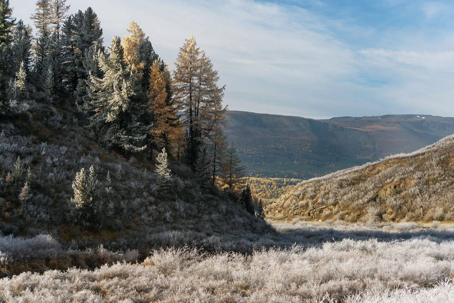 Несомненное счастье фотографа ждало нас за очередным поворотом горной реки. Совершенно неожиданно мы попали в серебряное царство. Легкий иней покрыл зеленые кедры и золотые лиственницы, маленькие деревца, траву и кустарники по берегам реки Чибитки.
