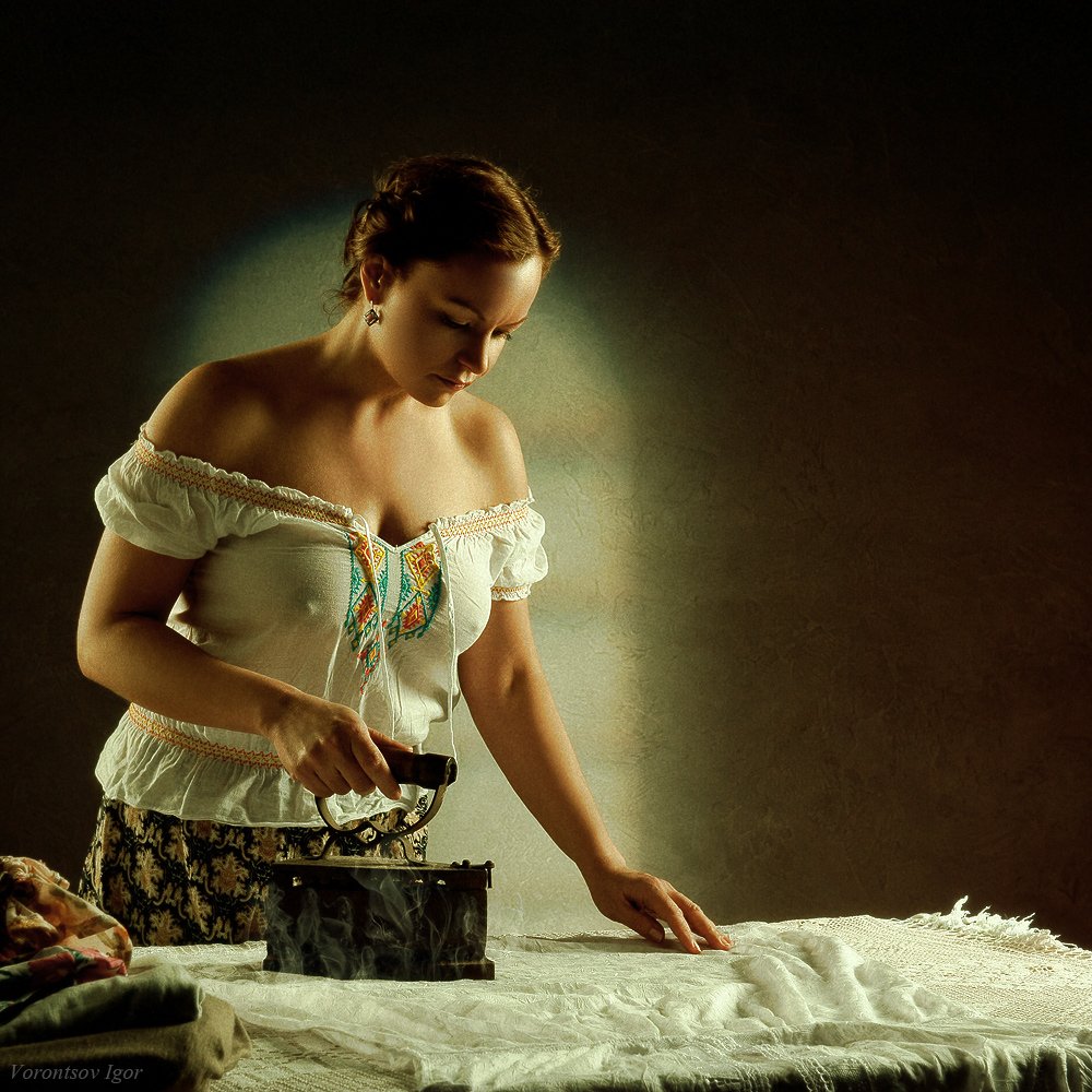 Really lovely photo. The iron is eye-catching for its antique charm. The girl grabs the viewer with her full-bodied charms. Oh to have a laundry-maid like that.