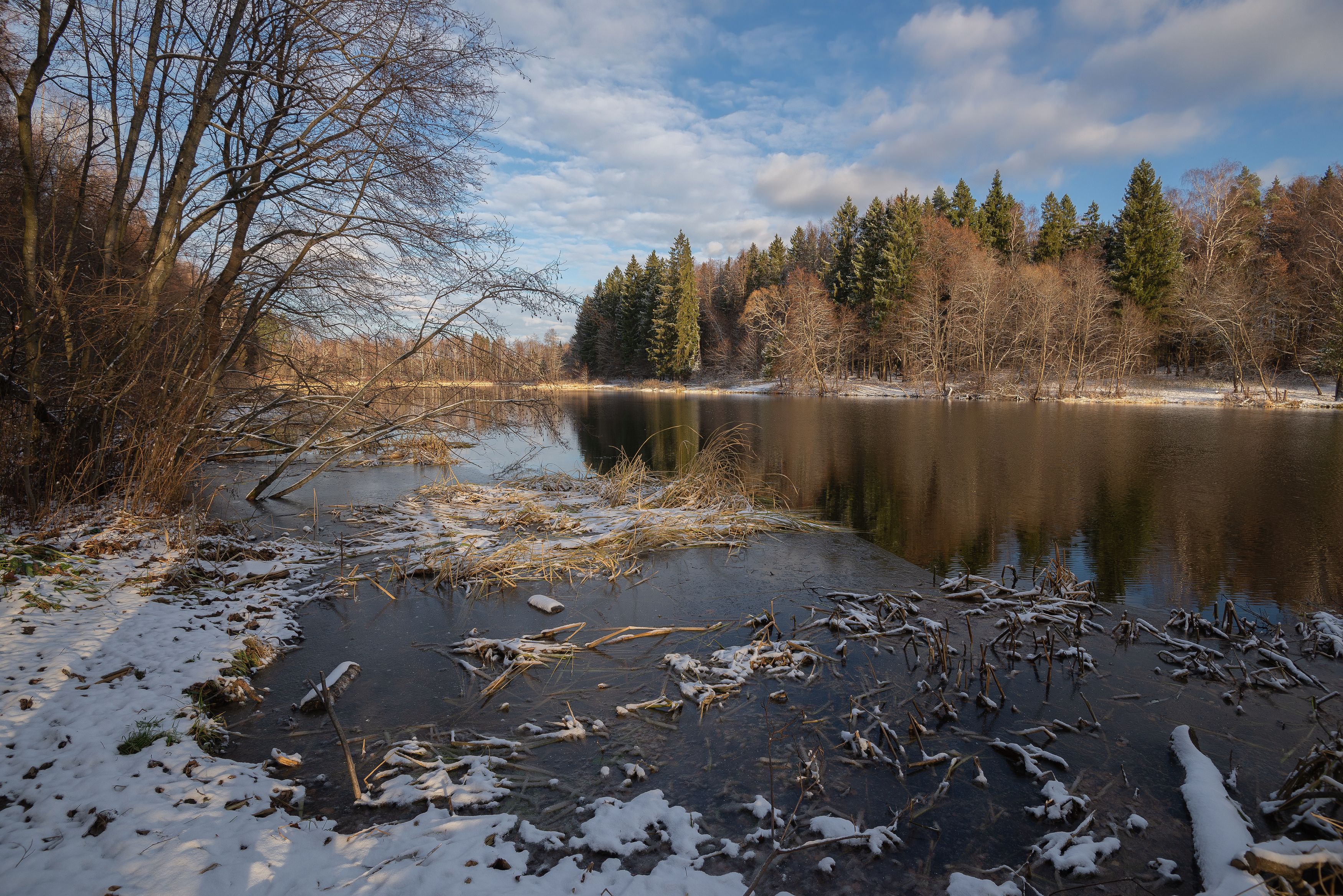 река, осень, снег, ноябрь, лес, Сергей Аникин