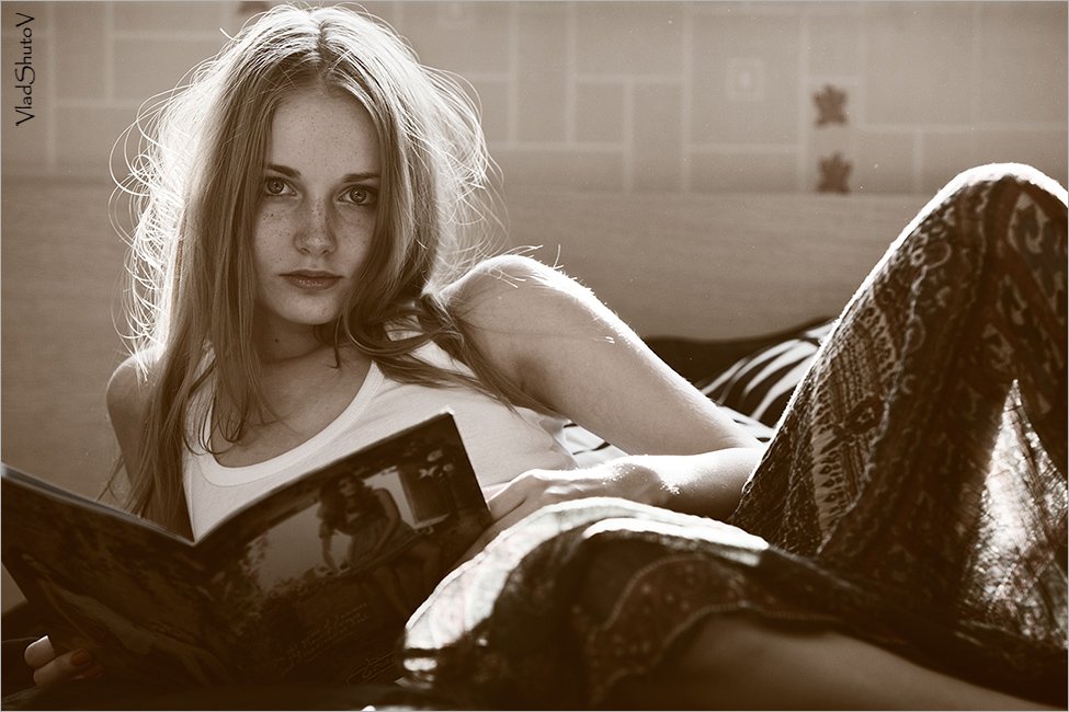 хорошая фотография, красивая модель, но это только мне кажется что левая нога как бы не ее? (поза какая-то не естественная) или я что-то не понял :) без обид