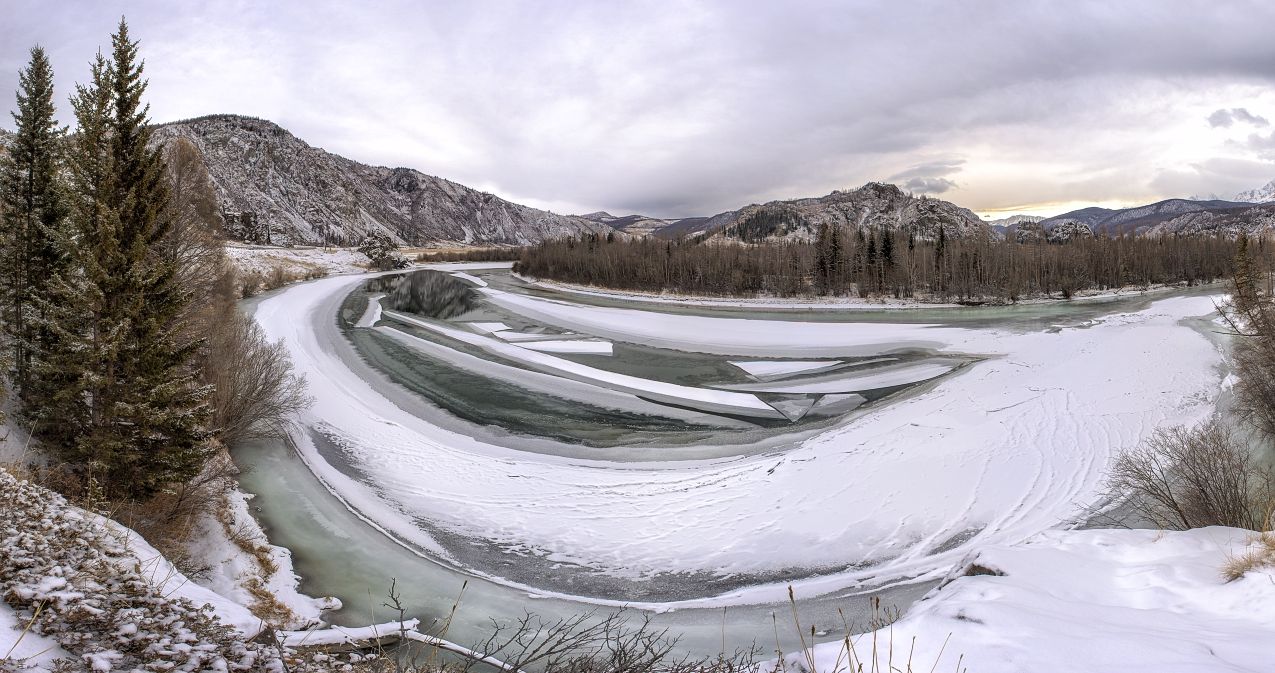 Тот день выдался урожайным на фото. Встав рано утром, я отправился домой и рассвет, заставший меня в пути, подарил мне серию с конями, создав отличное освещение для ландшафта. http://dmitriy1970.35photo.ru/photo_819600/ К закату я прибыл на живописный перевал, где низко висящее солнце создало ощущение воздуха и подчеркнуло объем. http://dmitriy1970.35photo.ru/photo_828589/ А в середине дня я остановился в живописнейшем месте и не жалея времени побродил по заснеженным берегам реки впечатляясь её изящными, грациозными изгибами…