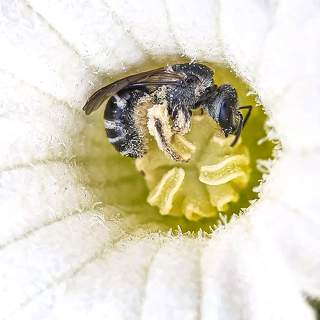 A tiny bee sits on a branch of a plant. Mobile photography