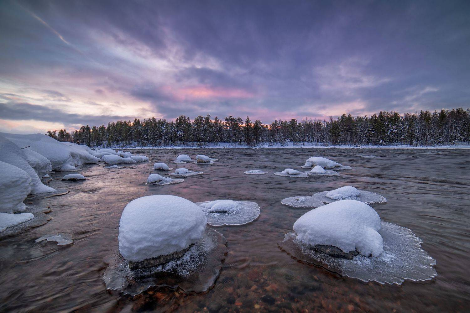 закат природа пейзаж река зима снег камни