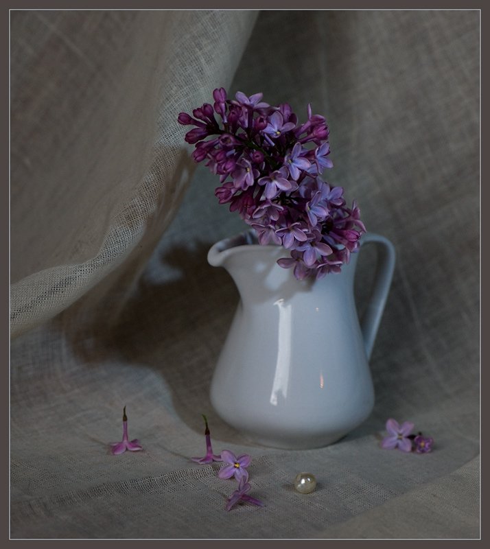 Жемчужинка,думаю, лишняя ( разве что закатить ее в тень кувшинчика...). Свет бы лучше помягче...