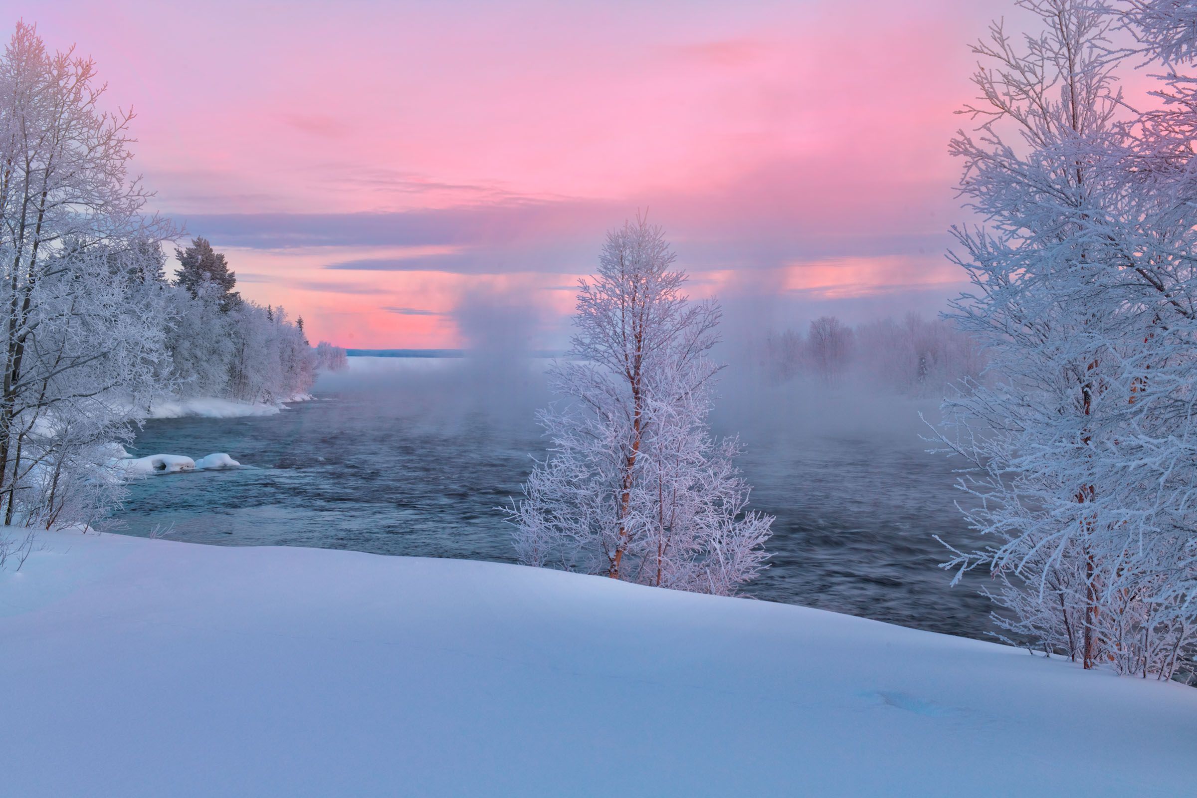 На снимке река Пиренга. На самих фотосъемках я был на этой реке 6-7 раз по утрам. Ни разу не попал на прямой солнечный восходный свет. Снимки такие видал, а сам нет. Все лучшие восходы для меня состоялись на Пиренге при восходной игре красно-пурпурных тонов света на небесах. Что, в общем, тоже неплохо.