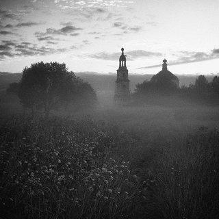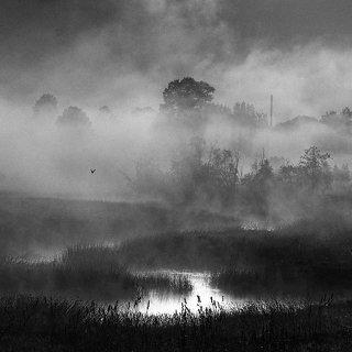 Утренняя рассветная слайдовая картинка с солнцем сквозь туман над прудом в Середниково