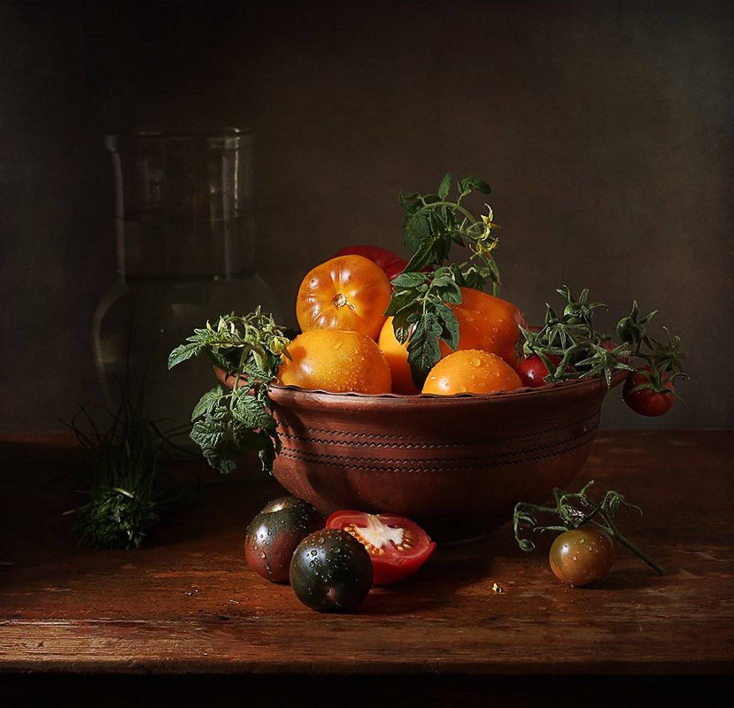Глиняная мискаПерсикиТоматы
